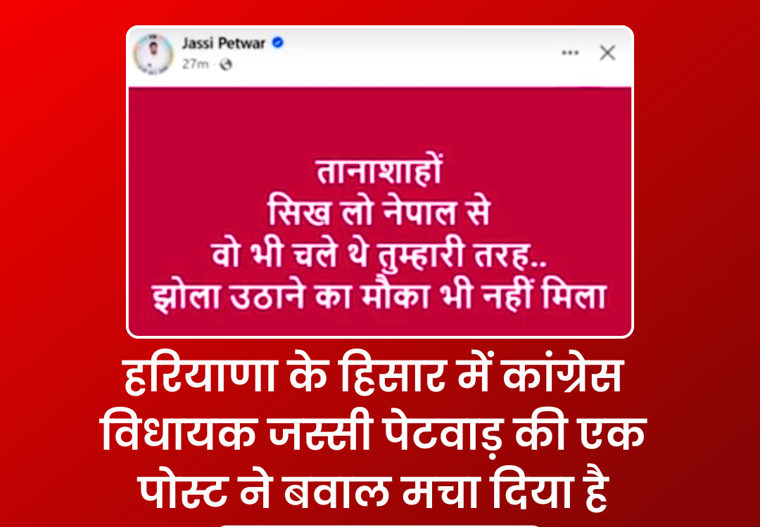 हरियाणा के हिसार से कांग्रेस विधायक जस्सी पेटवाड़ की एक फेसबुक पोस्ट ने सोशल मीडिया पर तहलका मचा दिया। विधायक ने अपनी पोस्ट में नेपाल की वर्तमान स्थिति की तुलना भारत के हालातों से की थी। हालांकि, विवाद बढ़ने के बाद उन्होंने पोस्ट को डिलीट कर दिया।